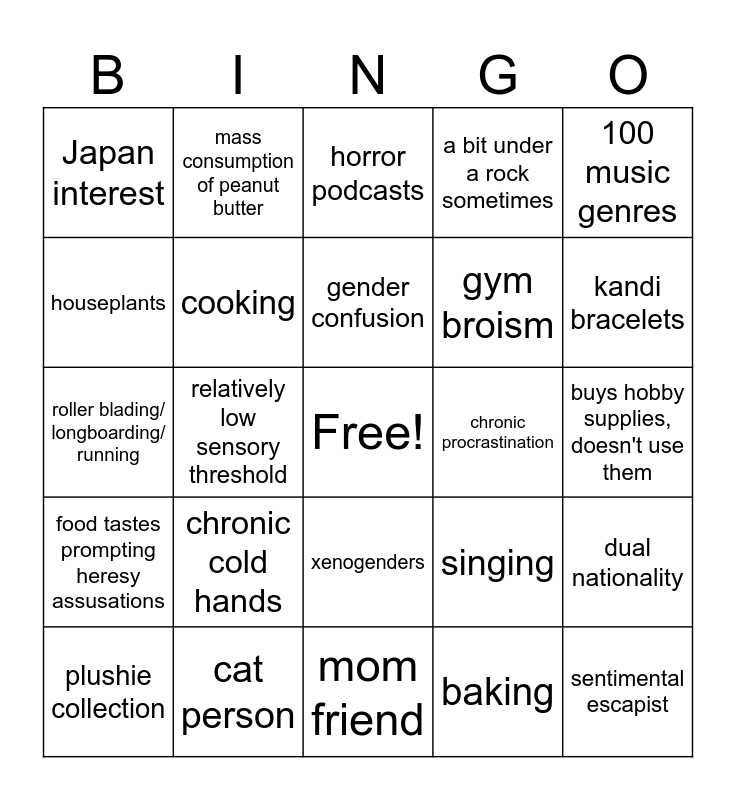 This bingo card has a free space and 24 words: chronic cold hands, cat person, gender confusion, plushie collection, 100 music genres, Japan interest, houseplants, mass consumption of peanut butter, chronic procrastination, xenogenders, gym broism, roller blading/ longboarding/ running, singing, dual nationality, cooking, baking, buys hobby supplies, doesn't use them, horror podcasts, kandi bracelets, relatively low sensory threshold, sentimental escapist, food tastes prompting heresy assusations, a bit under a rock sometimes and mom friend.