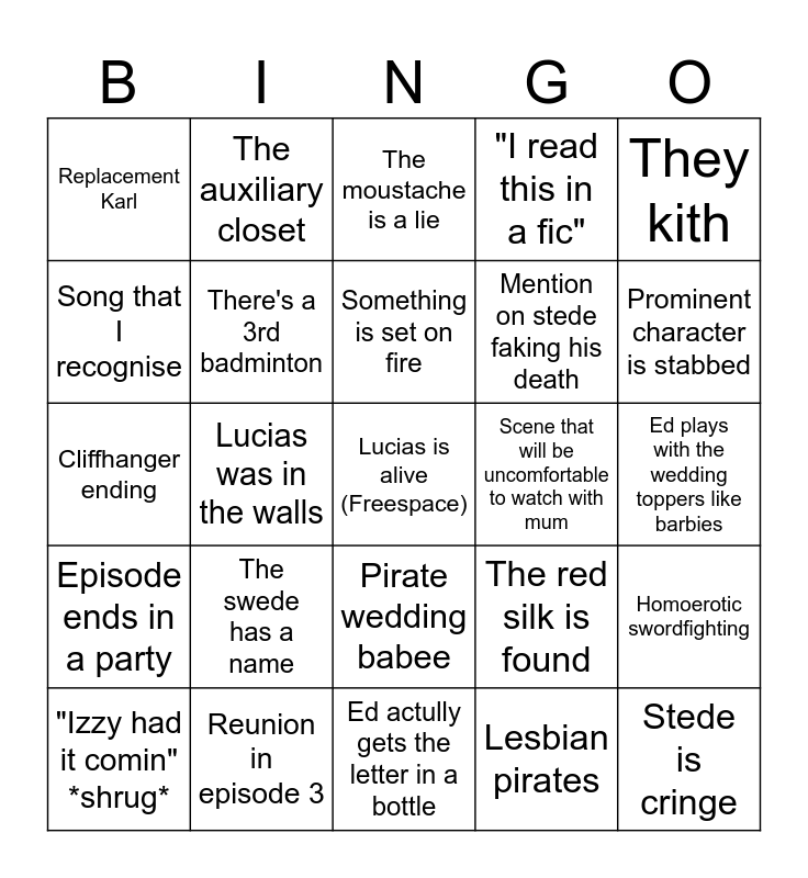 This bingo card has a free space and 24 words: "Izzy had it comin" *shrug*, The swede has a name, Something is set on fire, Lesbian pirates, They kith, Replacement Karl, The auxiliary closet, The moustache is a lie, Scene that will be uncomfortable to watch with mum, Ed plays with the wedding toppers like barbies, Cliffhanger ending, There's a 3rd badminton, The red silk is found, Homoerotic swordfighting, Song that I recognise, Reunion in episode 3, Ed actully gets the letter in a bottle, "I read this in a fic", Prominent character is stabbed, Episode ends in a party, Lucias was in the walls, Pirate wedding babee, Mention on stede faking his death and Stede is cringe.