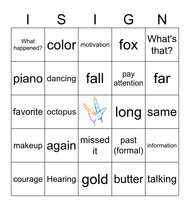 This bingo card has a free space and 110 words: chatter mouth, See you later, missed it, voice off, wait, hold, I don't know, giraffe, learning, hello, bathroom, one more, sign language, how many?, finished, time sign, again, please, sorry, understand, don't understand, bathroom, more, thank you, you're welcome, piano, dancing, coffee, love, frog, favorite, color, fall, change, remember, makeup, play, past (informal), past (formal), bed, reading, newspaper, gold, fox, same, Deaf, Hearing, music, rain, talking, bless you, correct, hungry, waiter, message, tiger, platypus, cat, What are you doing?, What's that?, What happened?, How are you?, Cochlear Implant, bro, late, courage, lookin'fine, ugly, continue, spots, stain, support, motivation, definitely, hope, possible, together, experience, butter, pretty, hot, nothing, cold, seal, stingray, whale, seahorse, dolphin, animal, nice, jellyfish, octopus, sea turtle, pay attention, mind blown, clapping, wrong, Orca, important, information, kissing, forget, congrats, long, far, English, put it down, Spanish, Deaf Community and slow.