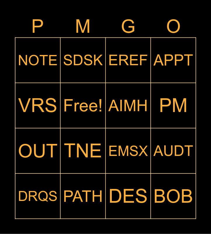 This bingo card has 52 words: PRQS, DRQS, TENV, MSG, TKT, CTS, SDSK, BREG, Free!, POLY, AIMH, MOVE, RAPS, IB, LOGA, PMAR, PM, PATH, MAVT, VRS, AUDT, TEAM, NOTE, OUT, CATS, MEOW, LDPX, FIRM, TNE, MAV, MOCA, APPT, SAIM, FON, DI, EREF, MYHR, EVAL, ONCL, HIRE, SECF, DES, BOB, BBZM, SHOW, LOGB, NEWS, EMSX, TC, OMX, BUX and RICH.