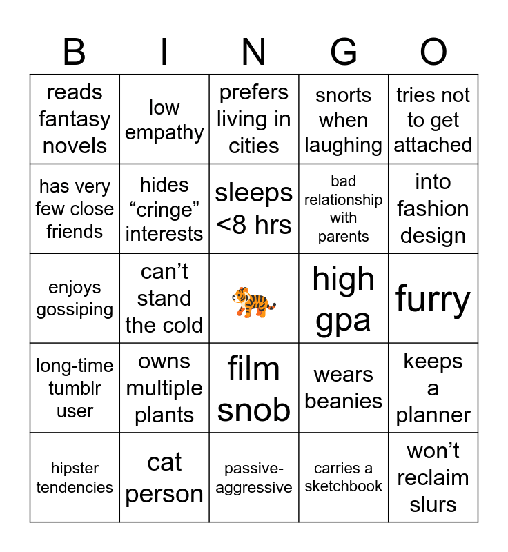 This bingo card has a free space and 24 words: hipster tendencies, owns multiple plants, sleeps <8 hrs, carries a sketchbook, tries not to get attached, reads fantasy novels, low empathy, prefers living in cities, high gpa, furry, enjoys gossiping, hides “cringe” interests, wears beanies, keeps a planner, has very few close friends, cat person, passive-aggressive, snorts when laughing, into fashion design, long-time tumblr user, can’t stand the cold, film snob, bad relationship with parents and won’t reclaim slurs.