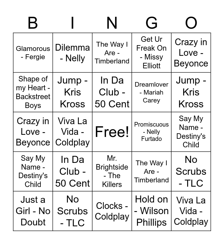 ⚠ This card has duplicate items: Just a Girl - No Doubt (2), No Scrubs - TLC (2), Vogue - Madonna (2), Say My Name - Destiny's Child (2), Hold on - Wilson Phillips (2), Freedom - George Michael (2), Jump - Kris Kross (2), Hand in My Pocket - Alanis Morissette (2), Dreamlover - Mariah Carey (2), Hot n Cold - Katy Perry (2), Get Ur Freak On - Missy Elliott (2), Hips Don't Lie - Shakira (2), Since U Been Gone - Kelly Clarkson (2), Always on Time - Ja Rule (2), Viva La Vida - Coldplay (2), Crazy in Love - Beyonce (2), Work It - Missy Elliott (2), In Da Club - 50 Cent (2), Promiscuous - Nelly Furtado (2), The Way I Are - Timberland (2)