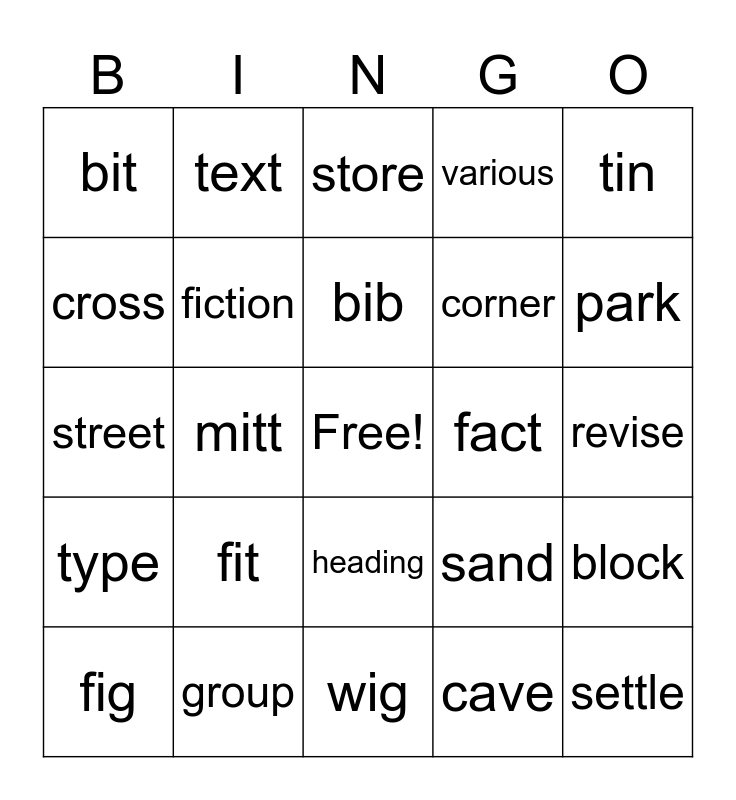 This bingo card has a free space and 25 words: fit, wig, bib, fig, tin, bit, cross, text, fact, heading, corner, street, sand, block, fiction, publish, revise, store, park, mitt, settle, group, type, various and cave.