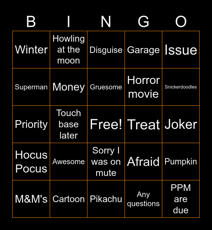This bingo card has a free space and 190 words: Scream, Haunted House, Orange, Fall, Pumpkin, Bobbing for Apples, October, Scary, Full Moon, Fun, Flashlight, Black Cat, Bats, Fear, Treat, Chocolate, Sorry I was on mute, Ghost, Spooky, Candy Apple, Mummy, Scarecrow, Boo, Monsters, Pumpkin, Music, Cemetary, Candy Corn, Black, Broom, Witch, Halloween, Spiders, Celebrate, Trick-or-Treat, Dead, Fires, Costume, Decorated, Makeup, Wig, Sorry I'm late, OMG, What a great costume, You are on mute, Any questions, What do you think, Next month, Holidays, Fall, Winter, Sports, Movie, Pumpkin Spice, Corn mazes, Snickers, Kit-Kat, M&M's, Skittles, Jolly Ranchers, Money, Prize, Best costume, Peanut butter, Steven King, Horror movie, Chat, PPM are due, Let's take this offline, Touch base later, In my opinion, Keep doing what you're doing, Awesome, Think outside the box, Thank you, The CREW, Issue, Risk, Safety, Quality, Serenity, Fun, Crafts, Candle, Fireplace, Snacks, Popcorn, Snickerdoodles, Breathe, Stretch, Priority, So many fires, Project, Monthly Reports, Update, What's new, Progress, Next topic, Comic, Cartoon, Timeout, Jack-o-lantern, Afraid, Evil, Eerie, Gruesome, Nightmare, Cauldron, Frightening, Darkness, Horrify, Disguise, Petrify, Terrify, Tombstone, Cobweb, Ghoulish, Hocus Pocus, Magic, Haunt, Howl, Dress-up, Candy, Monster Mash, Ghostbusters, Thriller, Superstition, Somebody's watching me, Gummy worms, Crypt, Wolf, Cast a spell, Voodoo doll, Psycho, Have a beer, Drink some wine, Decorations, Kitchen, Garage, Rake the leaves, Jump in the leaves, Cider, Donuts, Marshmallows, Hot chocolate, Pumpkin Pie, Roasted Pumpkins Seeds, Foggy, Shadow, Full moon, Howling at the moon, Dracula, Blood, Princess, Pirate, Pikachu, When I was a kid, When I was a teenager, Pokemon, Monopoly, Twister, Beanie Babies, Furby, Power Ranger, Bop-it, Walkman, Action Figures, Tickle Me Elmo, Nintendo, Too much sugar, Lego's, Fidget Spinner, Easy Bake Oven, Yoda, Barbie Movie, Harry Potter, Superman, Mickey Mouse, Minnie Mouse, Spiderman, Scooby-Doo, Joker, King Kong, Hello Kitty, Hulk, Charlie Brown, Gru, Minion, Casper and Transylvania.