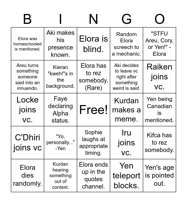 This bingo card has a free space and 30 words: Kurdan hearing something out of context., Kifca or Areu being muted., Faye declaring Alpha status., Areu cackling., Elora was homeschooled is mentioned., Elora is blind., Kieran "kweh!"s in the background., Sophie laughs at appropriate timing., Kurdan makes a meme., Elora ends up in the quotes channel., Yen being Canadian is mentioned., Yen's age is pointed out., Yen teleport blocks., Kei simping over her dragon boy., Raiken joins vc., Raiken is clueless on topic., Iru joins vc., C'Dhiri joins vc, "Yo, personally..." -Yen, "STFU Areu, Cory, or Yen!" -Elora, Locke joins vc., Locke is clueless on topic., Aki makes his presence known., Aki decides to leave vc right after something weird is said., Areu turns something someone said into an innuendo., Random Elora screech to a mechanic., Kifca has to rez somebody., Elora dies randomly., Elora has to rez somebody. (Rare) and Cory doing content..