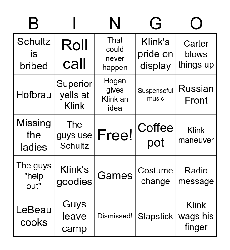 This bingo card has a free space and 37 words: Hogan hatches a plan, I see nothing! I know nothing!, The guys kiss the girl, Superior yells at Klink, Radio message, Klink's goodies, Hogan gives Klink an idea, The guys bring someone to camp, Carter blows things up, The guys impersonate a German, The guys use Schultz, Klink's pride on display, Klink wags his finger, Klink maneuver, Hofbrau, The guys "help out", Operation abra cadabra, That could never happen, Games, Coffee pot, Schultz is bribed, Russian Front, LeBeau cooks, Dismissed!, Klink gets a visit, Slapstick, Roll call, Detained, Hogan lets himself in, Searchlight or patrol, Schultz's boys, Guys leave camp, Missing the ladies, Use the tunnel, Costume change, Suspenseful music and Need to pivot.