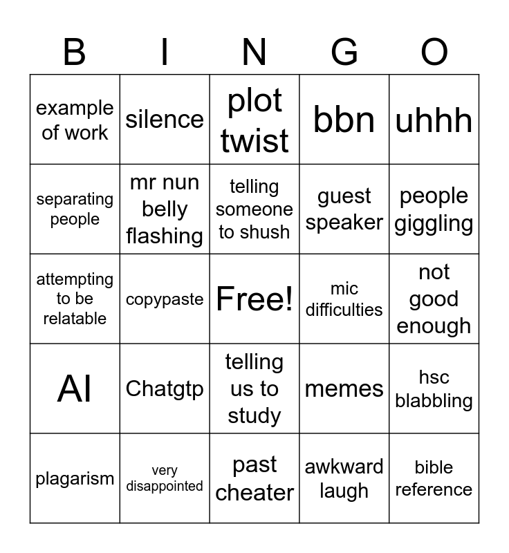 This bingo card has a free space and 24 words: Chatgtp, very disappointed, telling someone to shush, plagarism, uhhh, example of work, separating people, silence, mic difficulties, telling us to study, guest speaker, attempting to be relatable, memes, hsc blabbling, mr nun belly flashing, awkward laugh, not good enough, plot twist, people giggling, copypaste, bible reference, AI, bbn and past cheater.