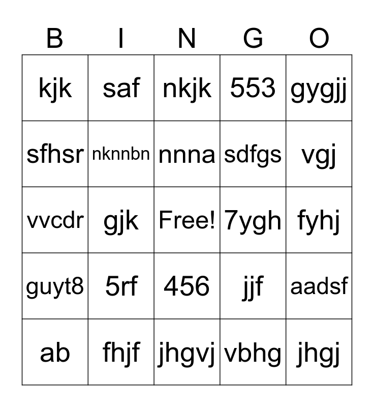 This bingo card has a free space and 29 words: ab, hjad, gjk, jkj, kjk, nkjk, nknnbn, 5rf, 7ygh, fhjf, fyhj, jhgj, jhgvj, vbhg, vgj, bnv, 456, guyt8, gygjj, vvcdr, jjf, ajsfj, sdfgs, sfhsr, 553, saf, aadsf, nnna and nsff.