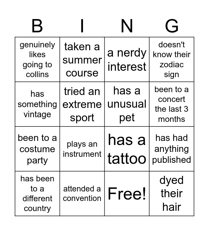 This bingo card has 17 words: Free!, has been to a different country, a nerdy interest, genuinely likes going to collins, plays an instrument, doesn't know their zodiac sign, has had anything published, has a unusual pet, been to a concert the last 3 months, tried an extreme sport, attended a convention, has a tattoo, has something vintage, taken a summer course, been to a costume party, likes podcasts and dyed their hair.
