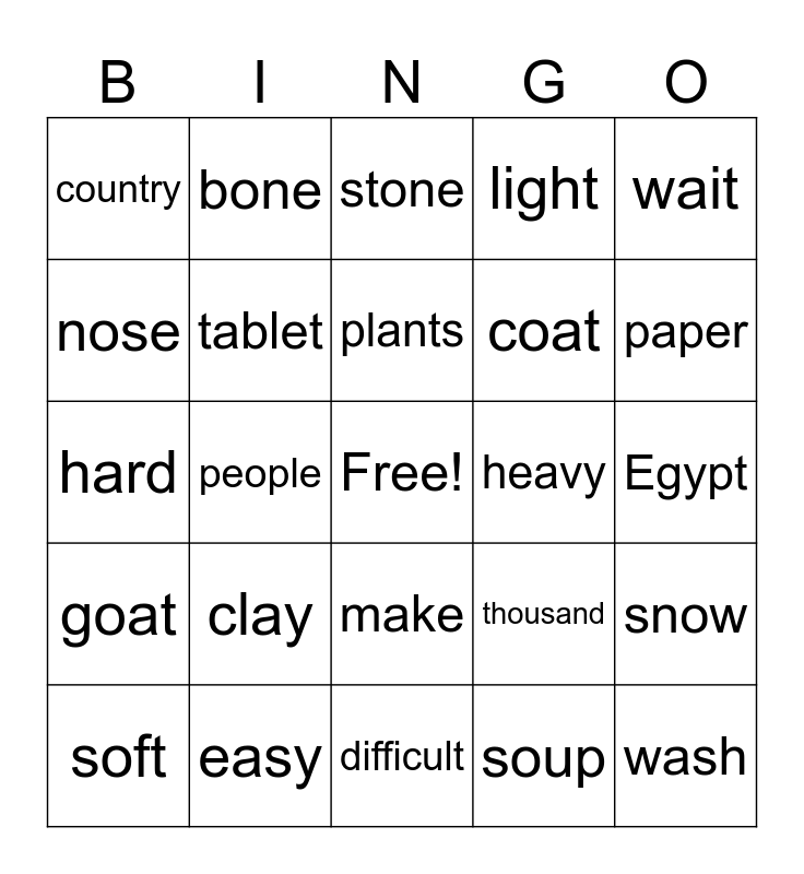 This bingo card has a free space and 28 words: snow, elbow, coat, soup, nose, stone, bone, goat, heavy, soft, hard, light, easy, difficult, paper, wet, clay, tablet, plants, make, country, expensive, wash, people, Egypt, thousand, wait and dry.