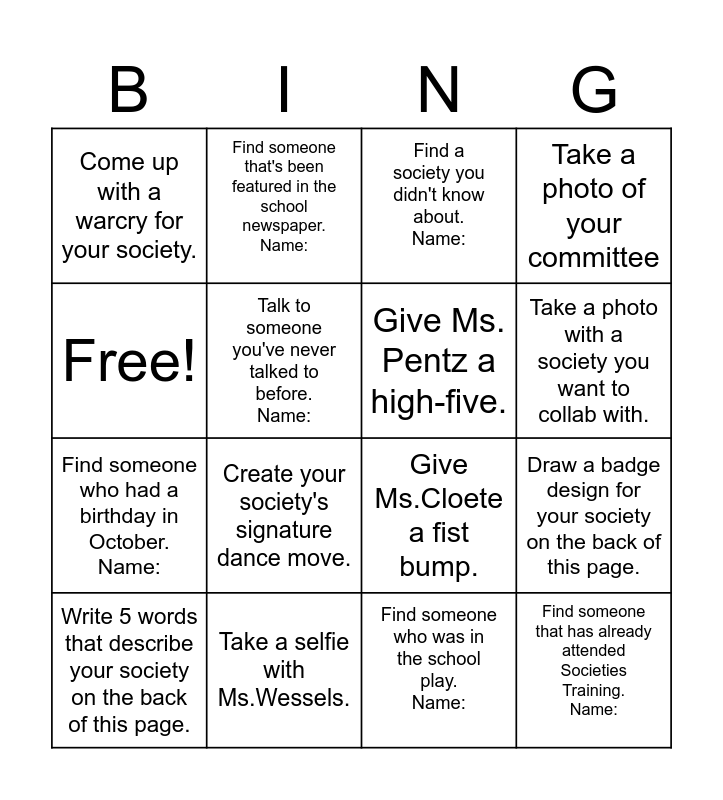 This bingo card has 16 words: Take a selfie with Ms.Wessels., Draw a badge design for your society on the back of this page., Find a society you didn't know about. Name:, Come up with a warcry for your society., Find someone who had a birthday in October. Name:, Find someone that's been featured in the school newspaper. Name:, Give Ms.Cloete a fist bump., Find someone who was in the school play. Name:, Free!, Talk to someone you've never talked to before. Name:, Write 5 words that describe your society on the back of this page., Take a photo of your committee, Create your society's signature dance move., Take a photo with a society you want to collab with., Give Ms. Pentz a high-five. and Find someone that has already attended Societies Training. Name:.
