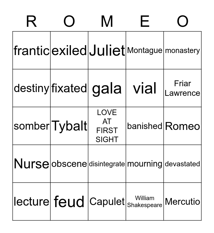 This bingo card has a free space and 24 words: obscene, feud, gala, lecture, monastery, frantic, destiny, exiled, banished, disintegrate, vial, somber, mourning, devastated, fixated, William Shakespeare, Romeo, Juliet, Friar Lawrence, Tybalt, Mercutio, Nurse, Montague and Capulet.