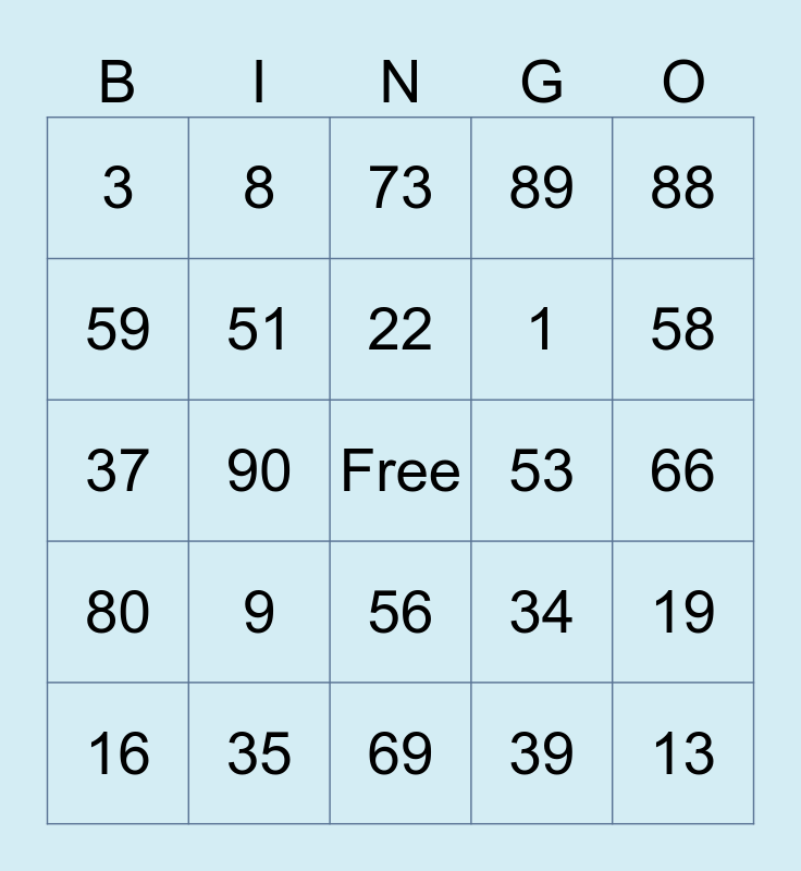 This bingo card has a free space and 65 words: 12, 11, 31, 19, 28, 18, 8, 5, 22, 38, 56, 33, 66, 88, 60, 59, 90, 3, 10, 1, 9, 80, 89, 4, 14, 2, 6, 7, 13, 15, 16, 17, 30, 32, 34, 35, 36, 37, 39, 50, 51, 52, 53, 54, 55, 57, 58, 61, 62, 64, 65, 67, 68, 69, 70, 71, 72, 73, 74, 75, 76, 77, 78, 79 and 63.