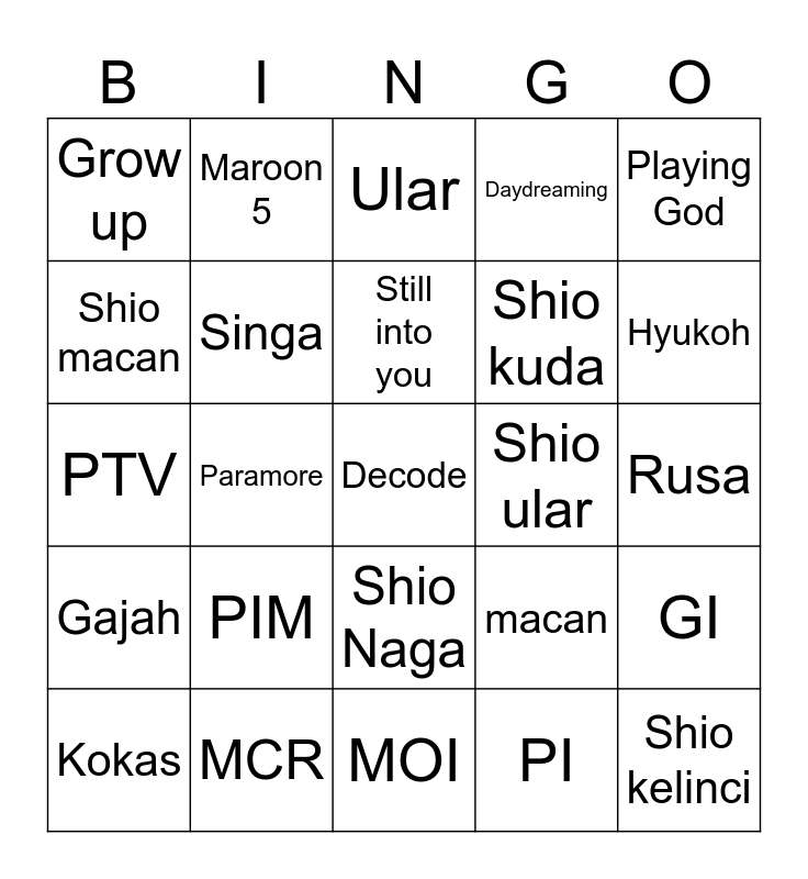 This bingo card has a free space and 24 words: PIM, MCR, Still into you, Kokas, Playing God, Grow up, Shio macan, Maroon 5, Shio ular, Shio Naga, Shio kuda, PTV, macan, GI, Singa, PI, Rusa, Ular, Hyukoh, Paramore, Shio kelinci, Gajah, Daydreaming and MOI.