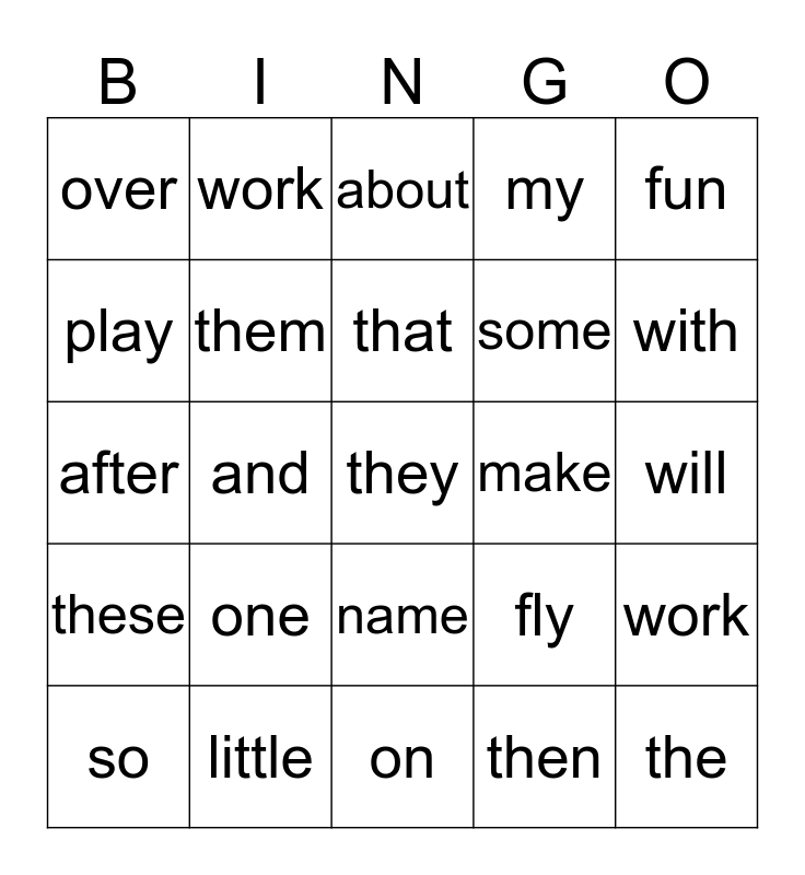 This bingo card has a free space and 24 words: one, little, that, so, fun, over, play, work, make, name, some, after, fly, work, them, then, will, about, with, and, the, these, my and on.