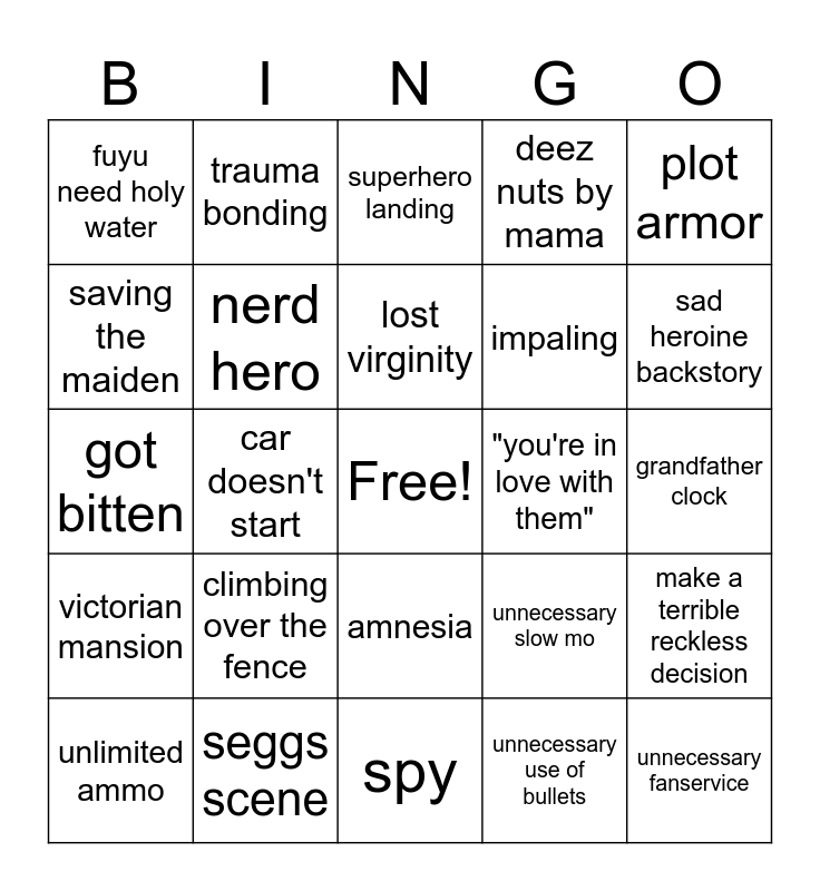This bingo card has a free space and 45 words: poor CGI, unnecessary fanservice, "i told you so", unlimited ammo, no reload, unnecessary use of bullets, superhero landing, model walk, plot armor, seggs scene, deez nuts by mama, "you're in love with them", amnesia, climbing over the fence, double agent, spy, traitor, got bitten, unnecessarily loud door, sad heroine backstory, trauma bonding, handcuffed, fuyu says "SEGGS", fuyu need holy water, unrequited love, grandfather clock, clock strikes midnight, unnecessary kissing, unnecessary slow mo, victorian mansion, breaks down door, make a terrible reckless decision, The end or was it?, shadow of the killer, discovers a clue in old paper / letters, car doesn't start, cellphone dies or no signal, based on a "true story", vigilante, lost virginity, saving the maiden, impaling, disembowelment, nerd hero and dead animal.