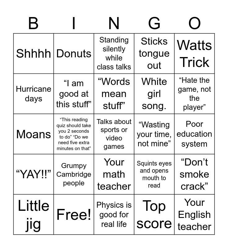 This bingo card has 28 words: “Don’t smoke crack”, Ron DeSantis, White girl song., Top score, Hurricane days, Standing silently while class talks, Donuts, “YAY!!”, “Wasting your time, not mine”, Little jig, Moans, Sticks tongue out, Free!, Physics is good for real life, “Hate the game, not the player”, “Play fast, but don’t hurry”, Grumpy Cambridge people, “I am good at this stuff”, “Words mean stuff”, Your math teacher, Shhhh, Your English teacher, Talks about sports or video games, “This reading quiz should take you 2 seconds to do” “Do we need five extra minutes on that”, Poor education system, Squints eyes and opens mouth to read, Watts Trick and Gravity goes down.
