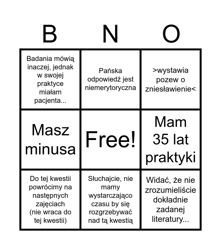 This bingo card has a free space and 8 words: Mam 35 lat praktyki, >wystawia pozew o zniesławienie<, Pańska odpowiedź jest niemerytoryczna, Do tej kwestii powrócimy na następnych zajęciach (nie wraca do tej kwestii), Badania mówią inaczej, jednak w swojej praktyce miałam pacjenta..., Widać, że nie zrozumieliście dokładnie zadanej literatury..., Masz minusa and Słuchajcie, nie mamy wystarczająco czasu by się rozgrzebywać nad tą kwestią.