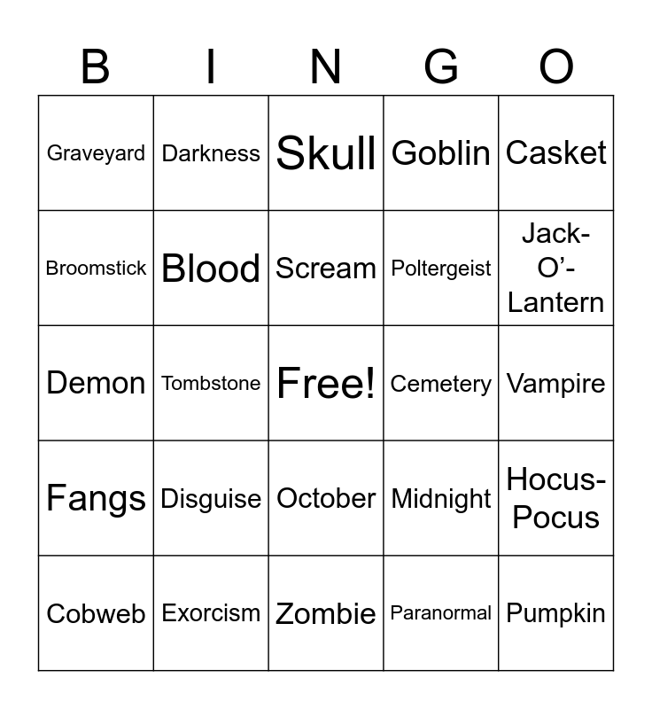 This bingo card has a free space and 61 words: Afterlife, Exorcism, Ghost, Fangs, Paranormal, Bat, Blood, Ghoul, Poltergeist, Bones, Goblin, Possession, Broomstick, Potion, Candle, Graveyard, Pumpkin, Casket, Cauldron, Scream, Cemetery, Skull, Cobweb, Hocus-Pocus, Howling, Spider, Coven, Incantations, Jack-O’-Lantern, Spirits, Candy, Costume, Cursed, Superstition, Darkness, Dead, Werewolf, Tombstone, Trick-Or-Treat, Demon, Magic, Disguise, Vampire, Enchanted, Midnight, Wand, Monster, Witch, Evil, October, Zombie, Haunted House, Cat, Crow, Mummy, Party, Pirate, Scarecrow, Princess, Prince and Scary.