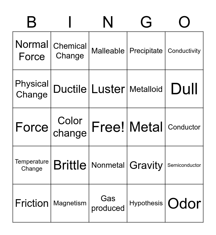 This bingo card has a free space and 24 words: Brittle, Magnetism, Luster, Friction, Conductivity, Normal Force, Physical Change, Chemical Change, Metal, Nonmetal, Metalloid, Force, Gravity, Semiconductor, Ductile, Hypothesis, Conductor, Malleable, Dull, Color change, Odor, Temperature Change, Precipitate and Gas produced.