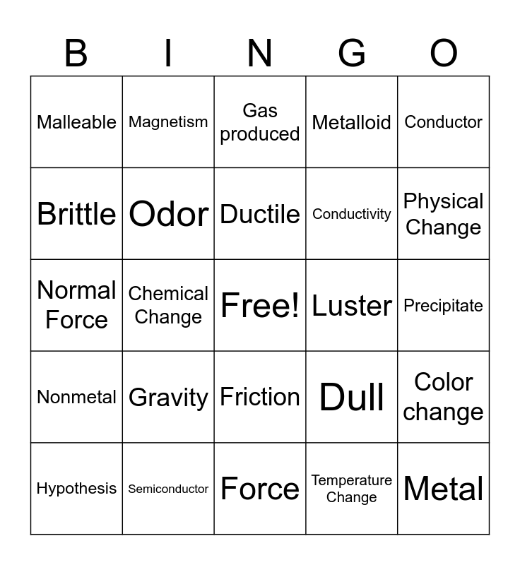 This bingo card has a free space and 24 words: Gravity, Semiconductor, Ductile, Hypothesis, Conductor, Malleable, Brittle, Magnetism, Luster, Friction, Conductivity, Normal Force, Dull, Color change, Odor, Temperature Change, Precipitate, Gas produced, Physical Change, Chemical Change, Metal, Nonmetal, Metalloid and Force.