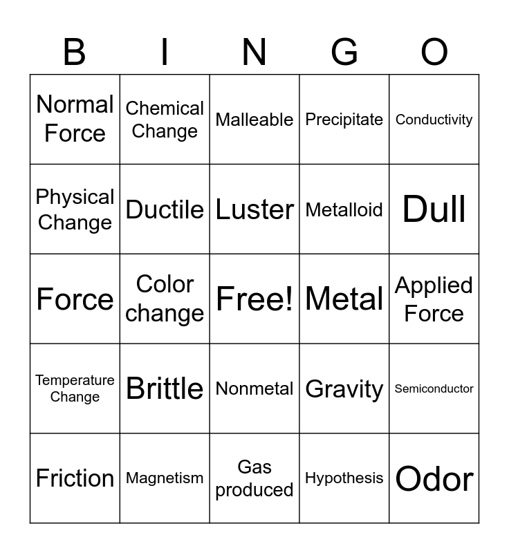 This bingo card has a free space and 24 words: Brittle, Magnetism, Luster, Friction, Conductivity, Normal Force, Physical Change, Chemical Change, Metal, Nonmetal, Metalloid, Force, Gravity, Semiconductor, Ductile, Hypothesis, Applied Force, Malleable, Dull, Color change, Odor, Temperature Change, Precipitate and Gas produced.