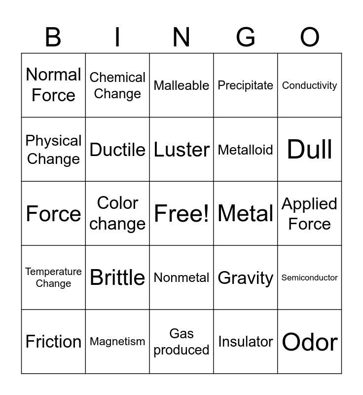 This bingo card has a free space and 24 words: Brittle, Magnetism, Luster, Friction, Conductivity, Normal Force, Physical Change, Chemical Change, Metal, Nonmetal, Metalloid, Force, Gravity, Semiconductor, Ductile, Insulator, Applied Force, Malleable, Dull, Color change, Odor, Temperature Change, Precipitate and Gas produced.