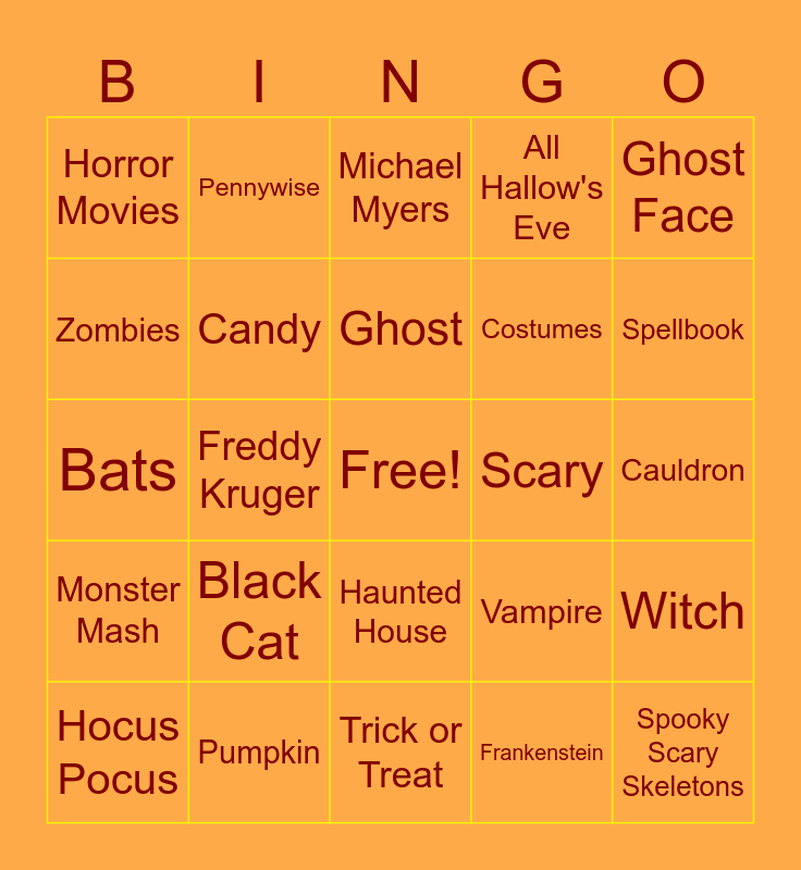 This bingo card has a free space and 24 words: Black Cat, Pumpkin, Ghost, Hocus Pocus, Ghost Face, Horror Movies, Zombies, Pennywise, Scary, Haunted House, Costumes, Bats, Vampire, Witch, Candy, Frankenstein, Cauldron, Michael Myers, Spellbook, Freddy Kruger, Spooky Scary Skeletons, Monster Mash, All Hallow's Eve and Trick or Treat.