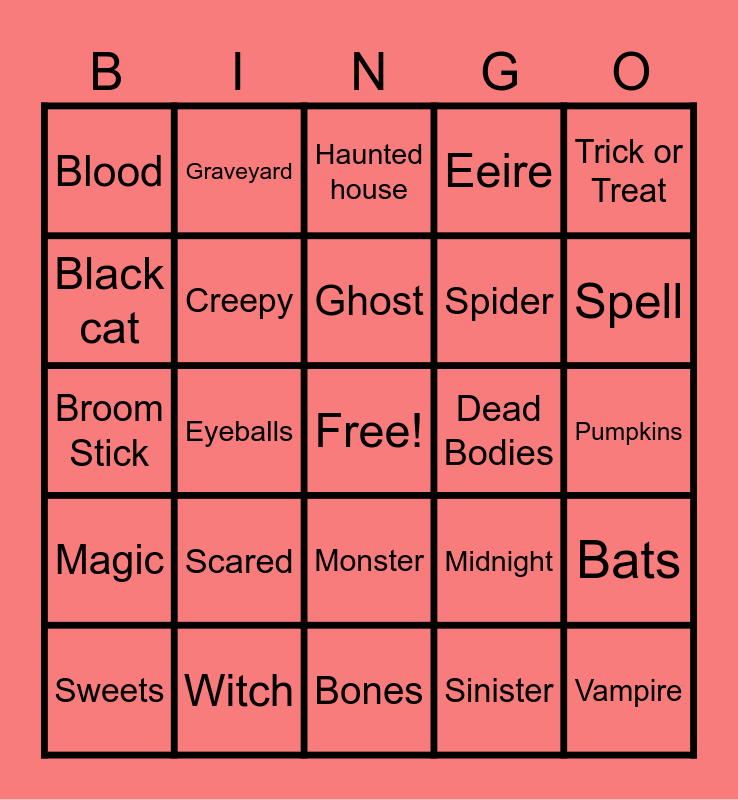 This bingo card has a free space and 24 words: Scared, Witch, Ghost, Sweets, Trick or Treat, Blood, Black cat, Graveyard, Dead Bodies, Monster, Spider, Broom Stick, Midnight, Bats, Creepy, Sinister, Pumpkins, Haunted house, Spell, Eyeballs, Vampire, Magic, Eeire and Bones.
