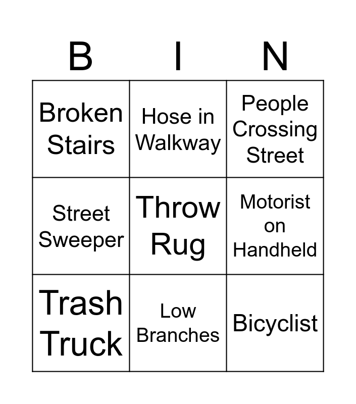 This bingo card has a free space and 8 words: Motorist on Handheld, People Crossing Street, Hose in Walkway, Trash Truck, Broken Stairs, Bicyclist, Street Sweeper and Low Branches.