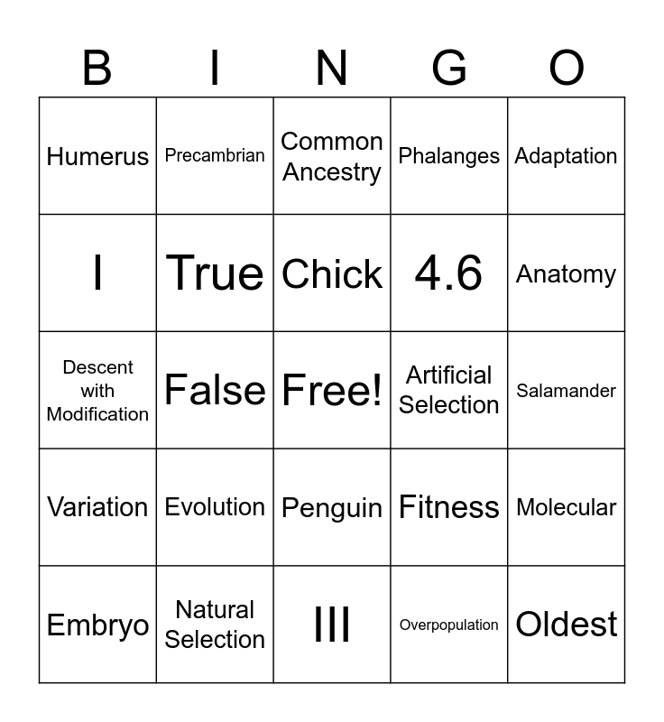 This bingo card has a free space and 24 words: Evolution, Natural Selection, Chick, Embryo, Adaptation, Humerus, I, Precambrian, Artificial Selection, Penguin, 4.6, Descent with Modification, Fitness, Molecular, True, Overpopulation, Salamander, Common Ancestry, Anatomy, False, Oldest, Variation, Phalanges and III.