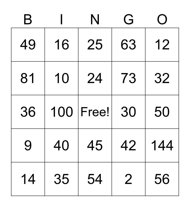This bingo card has a free space and 34 words: 1, 2, 4, 6, 9, 10, 12, 14, 16, 18, 24, 25, 27, 28, 30, 32, 35, 36, 40, 42, 45, 48, 49, 50, 54, 56, 63, 64, 73, 81, 90, 100, 144 and 400.