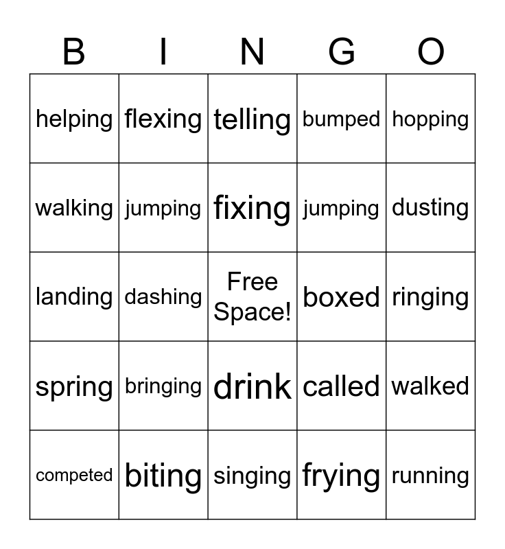 This bingo card has a free space and 24 words: bringing, biting, fixing, competed, hopping, helping, walking, flexing, boxed, drink, jumping, landing, called, walked, jumping, frying, ringing, telling, dusting, dashing, running, spring, bumped and singing.