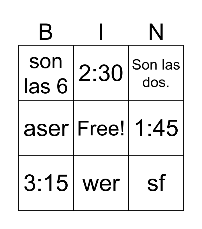 This bingo card has a free space and 8 words: 1:45, Son las dos., 2:30, 3:15, son las 6, sf, aser and wer.
