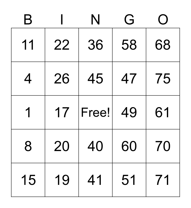 This bingo card has a free space and 24 words: 15, 20, 45, 51, 68, 11, 22, 36, 49, 61, 1, 26, 60, 70, 4, 19, 41, 58, 75, 8, 17, 40, 47 and 71.