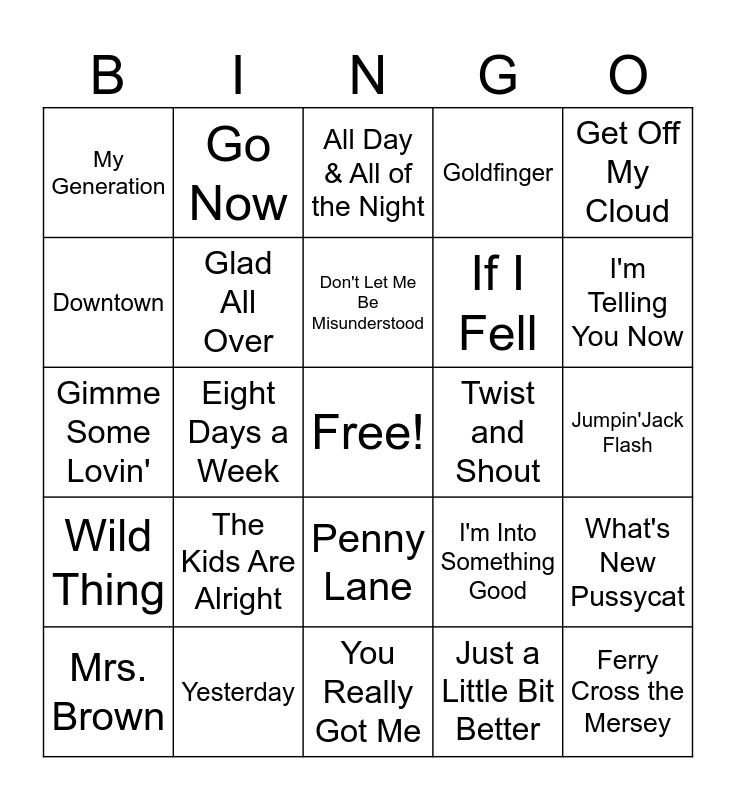 This bingo card has a free space and 75 words: 19th Nervous Breakdown, A Hard Day's Night, All Day & All of the Night, All My Loving, As Tears Go By, Bus Stop, Can't Buy Me Love, Carrie Anne, Catch Us If You Can, Dandy, Day Tripper, Do Wah Diddy Diddy, Don't Let Me Be Misunderstood, Downtown, Drive My Car, Eight Days a Week, Eleanor Rigby, Ferry Cross the Mersey, For Your Love, Get Off My Cloud, Gimme Shelter, Gimme Some Lovin', Glad All Over, Go Now, Goldfinger, Help, Honky Tonk Woman, House of the Rising Sun, I Only Want to Be With You, I Saw Her Standing There, I Should Have Known Better, I Wanna Hold Your Hand, I'm Henry VIII I Am, I'm Into Something Good, I'm Telling You Now, If I Fell, It Won't Be Long, It's Not Unusual, Jumpin'Jack Flash, Just a Little Bit Better, Just One Look, Let's Spend the Night Together, Love Potion No. 9, Mellow Yellow, Michelle, Mother's Little Helper, Mrs. Brown, My Generation, Norwegian Wood, Nowhere Man, Over and Over, Penny Lane, Roll Over Beethoven, Satisfaction, Season of the Witch, She Loves You, She's Not There, Stop Stop Stop, Sunshine Superman, Tell Her No, The Kids Are Alright, There's a Kind of Hush, Ticket to Ride, Time is On My Side, Tired of Waiting for You, Twist and Shout, We Can Work it Out, We Gotta Get Out of This Place, Well Respected Man, What's New Pussycat, Wild Thing, Yesterday, You Don't Have to Say You Love Me, You Really Got Me and You've Got to Hide Your Love Away.