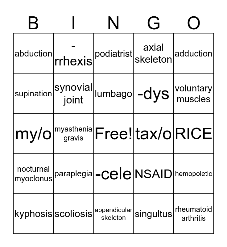 This bingo card has a free space and 24 words: paraplegia, scoliosis, lumbago, kyphosis, adduction, abduction, supination, -rrhexis, tax/o, -cele, -dys, my/o, NSAID, hemopoietic, synovial joint, singultus, RICE, podiatrist, voluntary muscles, myasthenia gravis, rheumatoid arthritis, nocturnal myoclonus, axial skeleton and appendicular skeleton.