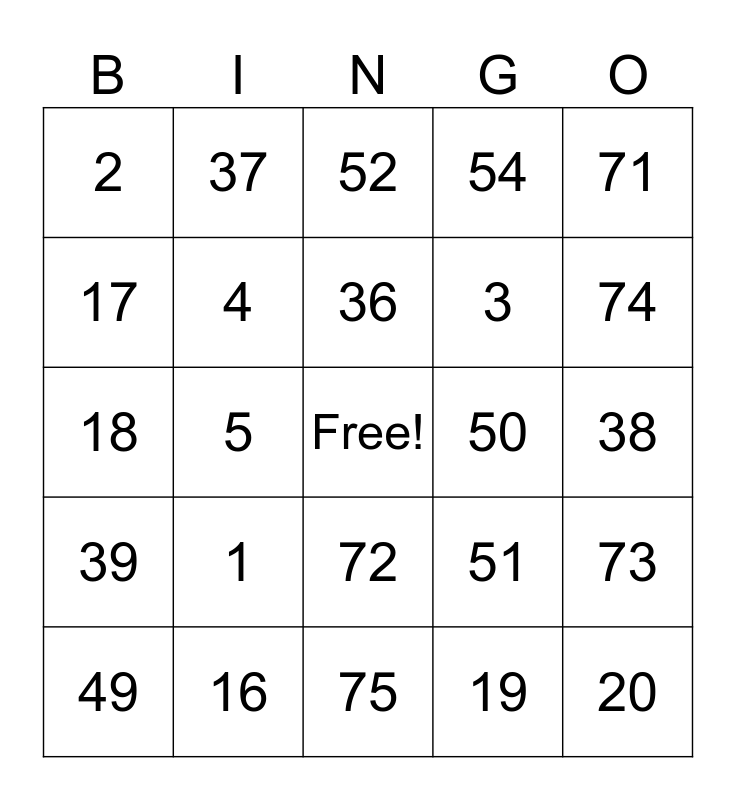 This bingo card has a free space and 24 words: 1, 16, 36, 49, 71, 2, 17, 37, 50, 72, 3, 18, 51, 73, 4, 19, 38, 52, 74, 5, 20, 39, 54 and 75.