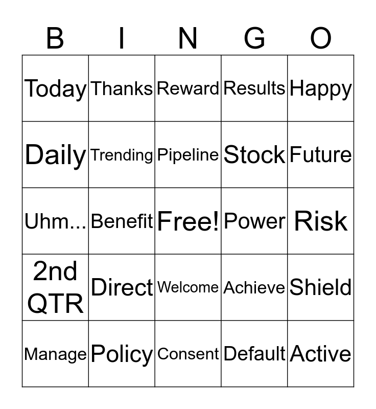 This bingo card has a free space and 24 words: Direct, Policy, Pipeline, Manage, Happy, Today, Daily, Thanks, Power, Welcome, Stock, Uhm..., Achieve, Shield, Trending, Default, Risk, Reward, Future, Benefit, Active, 2nd QTR, Results and Consent.