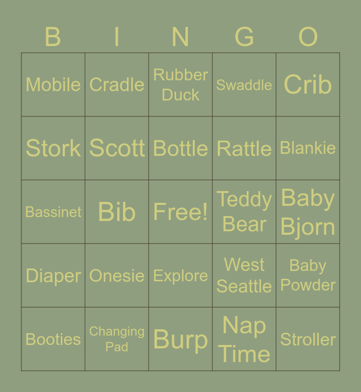 This bingo card has a free space and 36 words: Baby, Marmot, Anna, Scott, West Seattle, Diaper, Bottle, Pacifier, Crib, Skiing, Bib, Swaddle, High Chair, Teddy Bear, Blankie, Mobile, Teething, Onesie, Stroller, Rubber Duck, Baby Bjorn, Baby Powder, Changing Pad, Booties, Burp, Cradle, Bassinet, Milk, Rattle, Stork, Toys, Car Seat, Nap Time, Explore, Hike and Peanut.