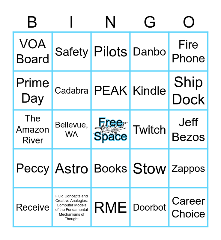 This bingo card has a free space and 40 words: 1994, The Amazon River, Alexa, Cadabra, Fluid Concepts and Creative Analogies: Computer Models of the Fundamental Mechanisms of Thought, Books, PEAK, Whole Foods, Fire Phone, Peccy, Bellevue, WA, Danbo, Career Choice, Jeff Bezos, Twitch, Astro, AtoZ, VOA Board, CMH3, Pilots, Zappos, Doorbot, Kindle, Prime Day, Affinity Groups, PXT, Area Manager, Process Assistant, Pick, LiDAR, Pack, Receive, ICQA, Stow, Ship Dock, RME, IT, Learning, Safety and Loss Prevention.
