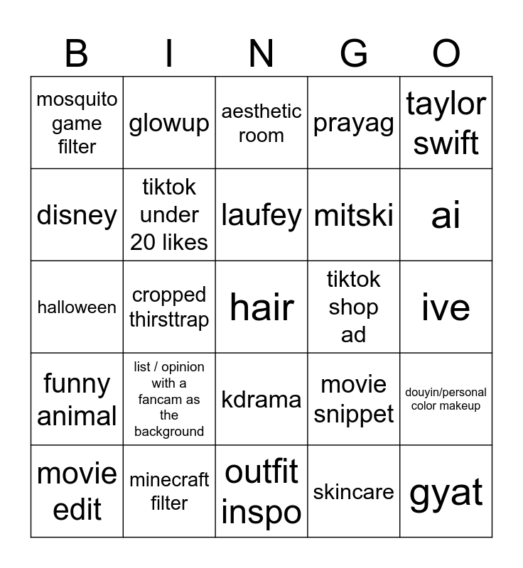 This bingo card has a free space and 24 words: list / opinion with a fancam as the background, minecraft filter, laufey, movie edit, taylor swift, mosquito game filter, disney, glowup, tiktok shop ad, kdrama, mitski, halloween, movie snippet, douyin/personal color makeup, tiktok under 20 likes, skincare, ive, aesthetic room, ai, cropped thirsttrap, gyat, funny animal, prayag and outfit inspo.