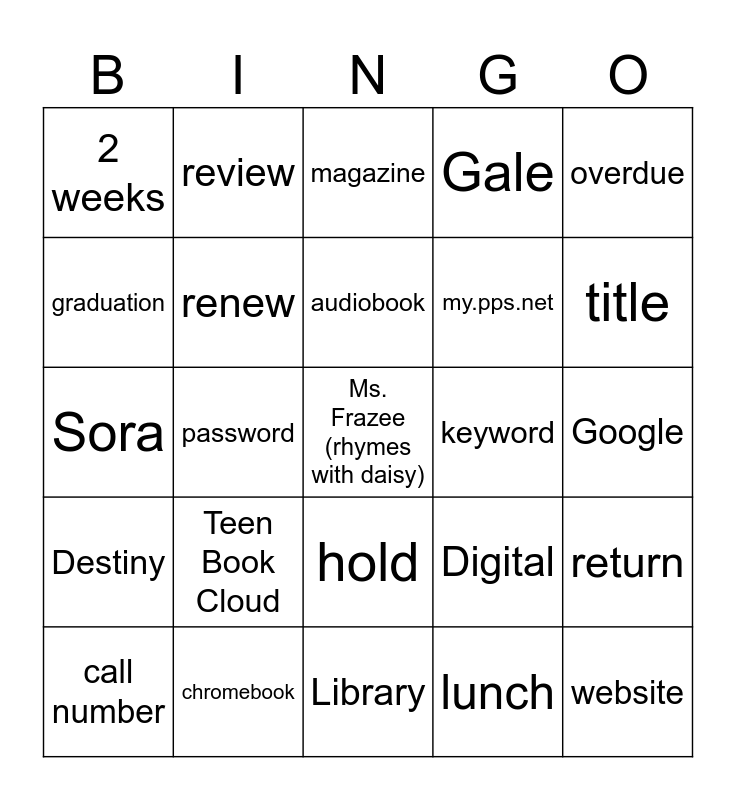 This bingo card has a free space and 33 words: library connect, Multnomah, password, birthday, Destiny, renew, overdue, call number, review, eBook, audiobook, magazine, search, author, keyword, title, chromebook, Sora, Teen Book Cloud, Digital, hold, ILL, 2 weeks, Google, Library, website, Gale, my.pps.net, graduation, return, damage, lunch and OBOB.