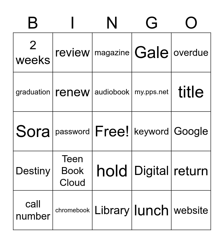 This bingo card has a free space and 33 words: library connect, Multnomah, password, birthday, Destiny, renew, overdue, call number, review, eBook, audiobook, magazine, search, author, keyword, title, chromebook, Sora, Teen Book Cloud, Digital, hold, ILL, 2 weeks, Google, Library, website, Gale, my.pps.net, graduation, return, damage, lunch and OBOB.