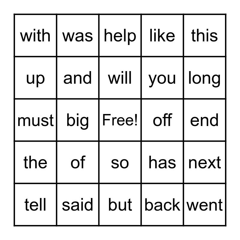 This bingo card has a free space and 36 words: sat, had, can, and, has, the, will, him, this, his, big, like, not, off, long, with, do, of, went, help, end, next, said, tell, but, was, must, your, you, up, by, be, back, so, are and she.