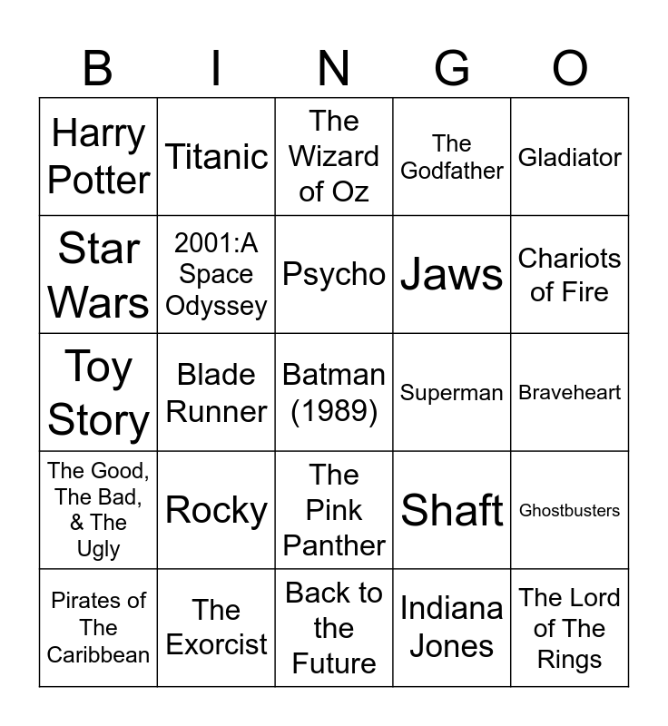 This bingo card has 28 words: Ghostbusters, Halloween, Jaws, Indiana Jones, Star Wars, The Wizard of Oz, Titanic, The Good, The Bad, & The Ugly, Superman, Pirates of The Caribbean, Toy Story, The Godfather, The Exorcist, Back to the Future, Chariots of Fire, ET, Rocky, 2001:A Space Odyssey, Psycho, The Pink Panther, Harry Potter, The Lord of The Rings, Batman (1989), Blade Runner, Braveheart, Shaft, Gladiator and Frozen.