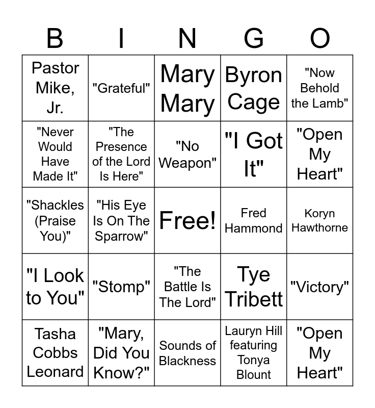 This bingo card has a free space and 49 words: Yolanda Adams, "Open My Heart", "Hold On (Change is Coming)", Sounds of Blackness, "Stomp", God's Property, "Grateful", Hezekiah Walker, "Never Would Have Made It", Marvin Sapp, "The Presence of the Lord Is Here", Byron Cage, "Victory", Tye Tribett, "Take Me to the King", Tamala Mann, "No Weapon", Fred Hammond, "Father Can You Hear Me", "Now Behold the Lamb", "His Eye Is On The Sparrow", Lauryn Hill featuring Tonya Blount, Pastor Mike, Jr., "I Got It", "Help Me", "Open My Heart", Tasha Cobbs Leonard, "You Know My Name", "The Battle Is The Lord", "I Look to You", Whitney Houston, "Help Me", "God Favored Me", "Lean On Me", "Mary, Did You Know?", Pentatonix, "Why We Sing", "Your Spirit", Koryn Hawthorne, "Won't He Do It", "The Storm is Over Now", "My Life is in Your Hands", Smokie Norful, "I Need You Now", "Shackles (Praise You)", Mary Mary, Charlie Wilson, "I'm Blessed" and "Every Praise".