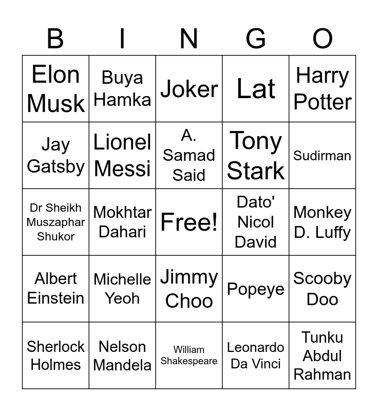 This bingo card has a free space and 24 words: Michelle Yeoh, Nelson Mandela, A. Samad Said, Sherlock Holmes, Harry Potter, Elon Musk, Jay Gatsby, Buya Hamka, Dato' Nicol David, Jimmy Choo, Tony Stark, Dr Sheikh Muszaphar Shukor, Popeye, Scooby Doo, Lionel Messi, Leonardo Da Vinci, Monkey D. Luffy, Joker, Sudirman, Mokhtar Dahari, Tunku Abdul Rahman, Albert Einstein, Lat and William Shakespeare.