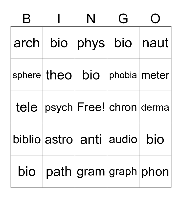 This bingo card has a free space and 29 words: bio, geo, psych, tech, arch, phys, theo, astro, chron, path, derma, phon, gram, graph, meter, scope, anti, biblio, naut, tele, audio, auto, phobia, sphere, bio, bio, bio, bio and bio.