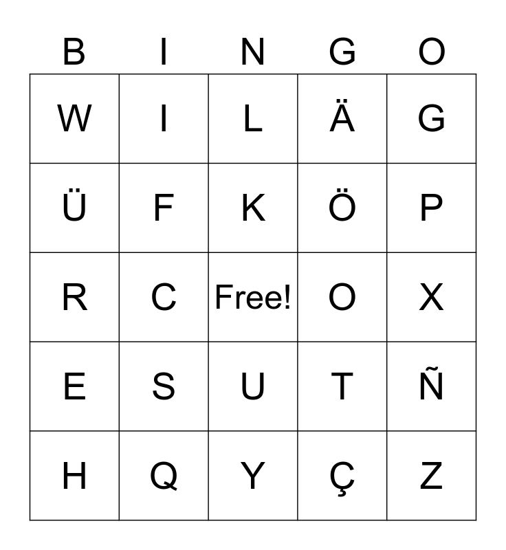 This bingo card has a free space and 33 words: A, B, C, D, E, F, G, H, I, J, K, L, M, N, O, P, Q, R, S, T, U, V, W, X, Y, Z, Ä, Ö, Ü, Ñ, Ó, Ç and Æ.